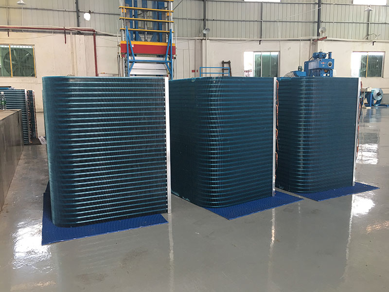 风机强制空气以3~5m/s速度通过冷凝排管,促进水膜蒸发,强化冷凝管外放热,并使吸热后的水滴在落下过程中为空气所冷却;蒸发过程中未被气化的水滴,经上部收水器后回落到下部水箱中,以减少水的消耗。除此之外,水箱内还设浮球阀,当水不断地蒸发消耗水箱中的水,水位过低时,浮球阀就自动打开补充冷却水。